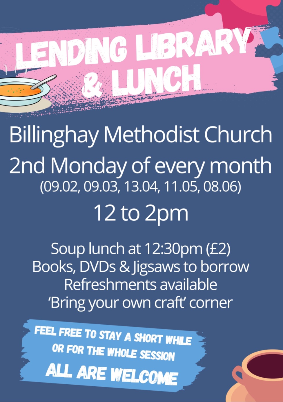 Regular activities: Lending Library and lunch 2nd Mondays, 12 to 2pm (see below) Charity Coffee Mornings Various (see below)